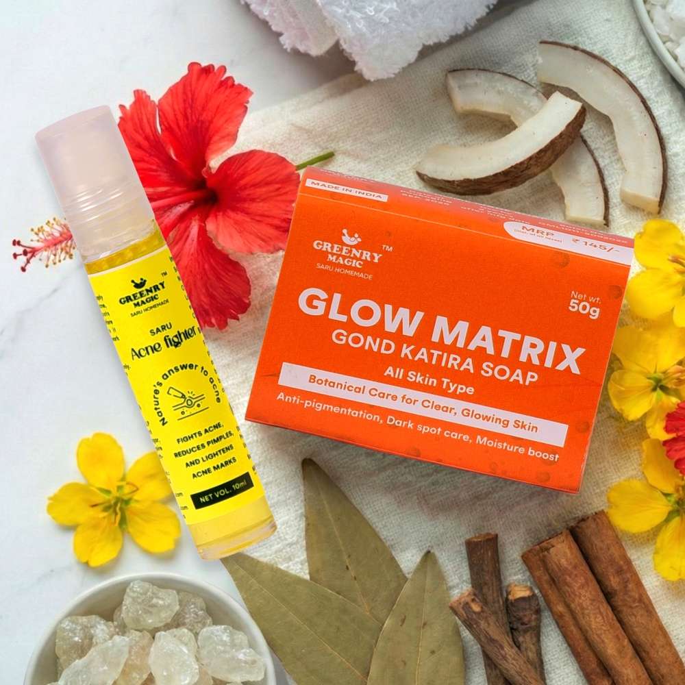 Stop choosing between fighting acne and achieving a healthy glow. The Clear Skin Essentials Duo by Greenry Magic is a curated two-step system designed to transform dull, breakout-prone skin into a clear, luminous masterpiece. Featuring the innovative Glow Matrix Gond Katira Soap, your skin receives a deep yet hydrating cleanse that targets pigmentation and uneven texture using the cooling power of botanical gums.