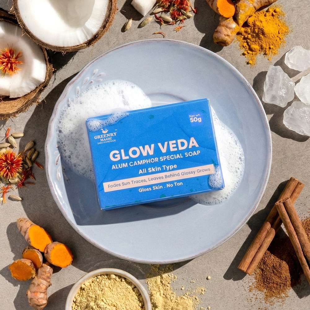 In a world of harsh chemicals and fleeting beauty trends, Glow Veda returns to the roots of authentic skincare. This isn’t just a bar of soap; it is a meticulously handcrafted ritual designed to breathe life back into tired, sun-damaged skin. At its heart lies a potent blend of Alum and Camphor, a traditional duo known for their incredible ability to deep-cleanse pores and tighten the skin, giving you that coveted “glass skin” finish.