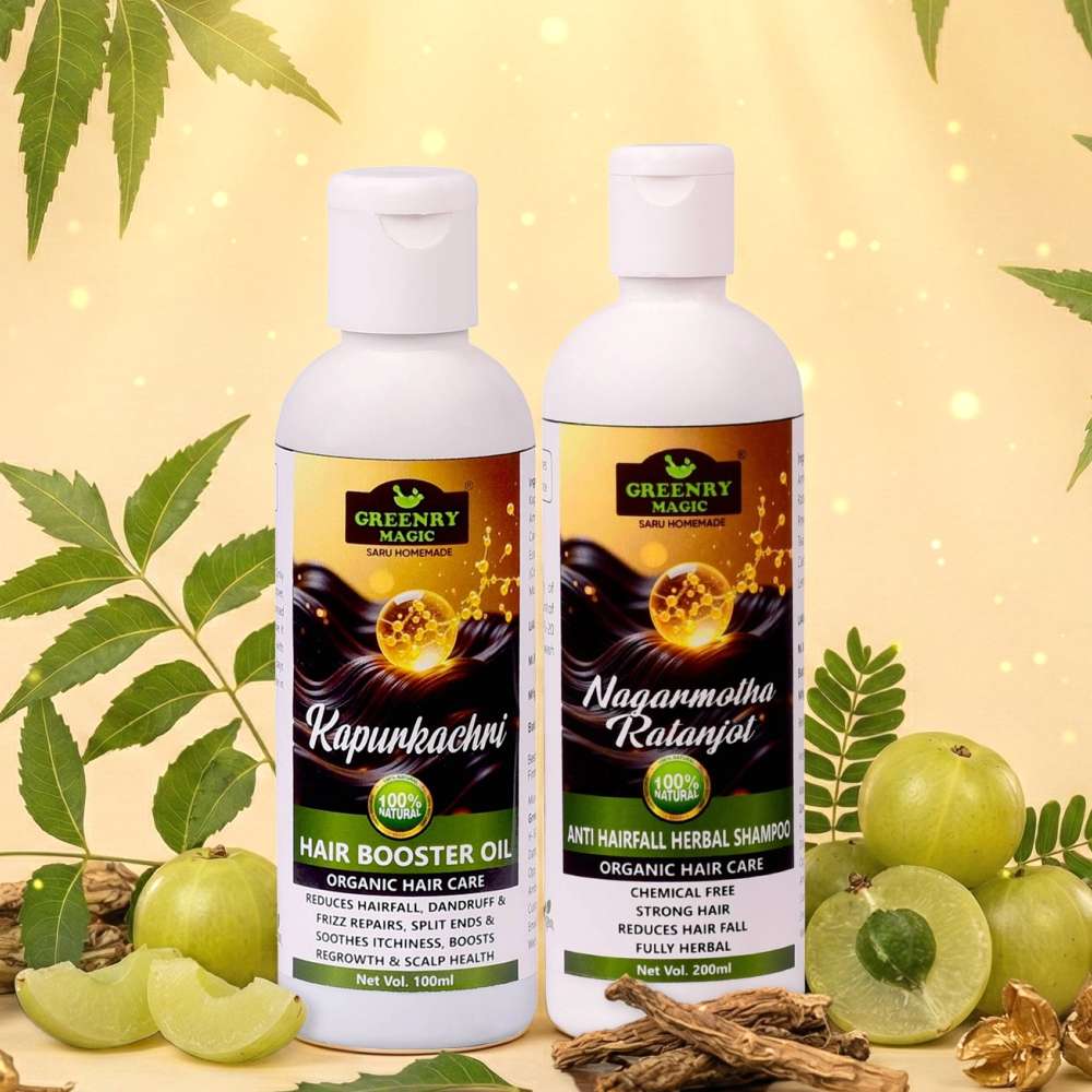 Experience the ultimate botanical synergy with the Greenry Magic Hair Growth Duo. This powerful combo pairs our Kapurkachri Hair Booster Oil with the Nagarmotha Ratanjot Anti-Hairfall Shampoo to tackle hair concerns at the root. The booster oil, rich in cold-pressed oils and Bhringraj, focuses on repairing frizz, soothing scalp itchiness, and stimulating dormant follicles. Following up with our herbal shampoo ensures that your hair is cleansed without the damage of sulfates or silicones. It is a 100% natural, vegan-friendly solution designed for those who refuse to compromise on purity. Whether you are dealing with thinning hair or a stressed scalp, this “Saru Homemade” ritual provides the nourishment needed for thicker, stronger, and shinier hair that reflects your inner health.