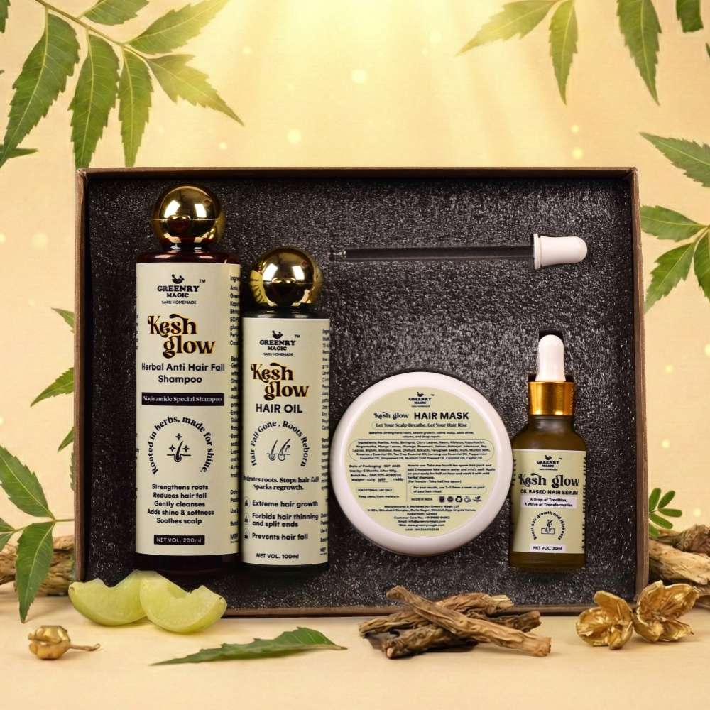The journey begins with our Hair Mask, a concentrated powder that draws out impurities and balances the scalp’s pH. Follow this with our Herbal Anti-Hair Fall Shampoo, which uses Niacinamide to improve blood circulation and strengthen the protein structure of your strands. For deep nourishment, the Kesh Glow Hair Oil penetrates the hair cortex to prevent split ends and thinning, while the Oil-Based Hair Serum acts as the final “glow-up,” sealing in moisture and providing a protective barrier against pollution and heat.