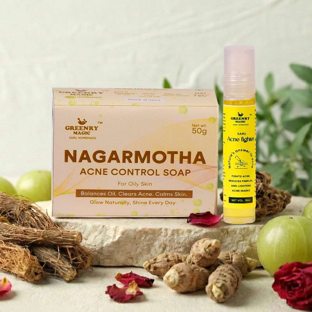Say goodbye to stubborn breakouts and uneven skin with the ultimate power duo from Greenry Magic. This specialized combo features the Nagarmotha Acne Control Soap and the Saru Acne Fighter Roll-On, specifically formulated for those struggling with oily and acne-prone skin.