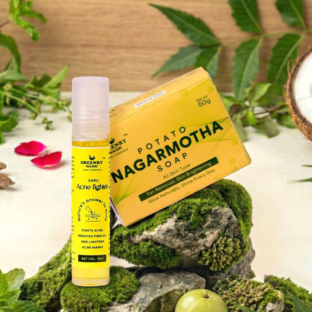 Experience the synergy of ancient earth-remedies and modern skin-clearing science. The Clarity & Glow Essentials combo is a two-part system designed to break the cycle of dullness and breakouts. Featuring our signature Potato Nagarmotha Soap, this duo starts by gently dissolving the “glue” that holds dead skin and tan to your face, revealing a brighter, more even-toned complexion. The second step is the Saru Acne Fighter, a targeted 10ml botanical infusion that uses nature’s most potent anti-inflammatories to shrink pimples and prevent future flare-ups. This kit is your answer to skin that feels congested, tired, or reactive. By replacing harsh synthetic chemicals with active plant enzymes, we provide a path to clear skin that doesn’t sacrifice your skin’s natural moisture barrier. It’s more than just a wash—it’s a daily restoration of your skin’s natural balance.